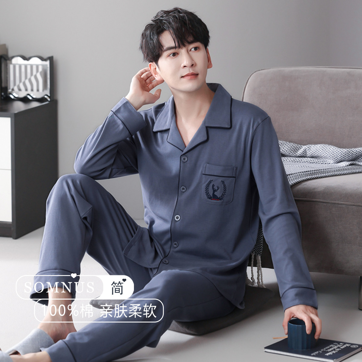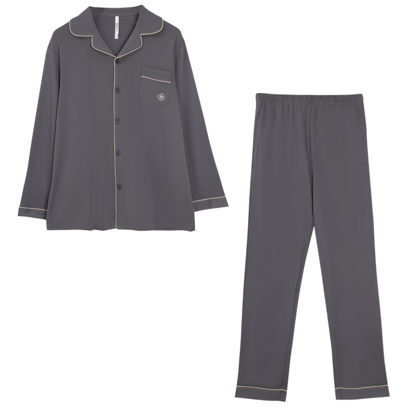 貓人男士睡衣男100%純棉灰色翻領(lǐng)開衫長(zhǎng)袖睡衣男休閑可