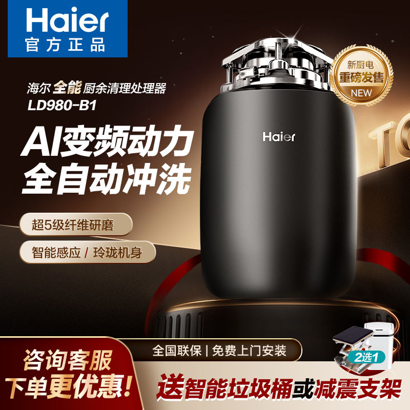 海爾垃圾處理器家用廚房食物材處理機(jī)靜音五級(jí)研磨不堵管道送配件