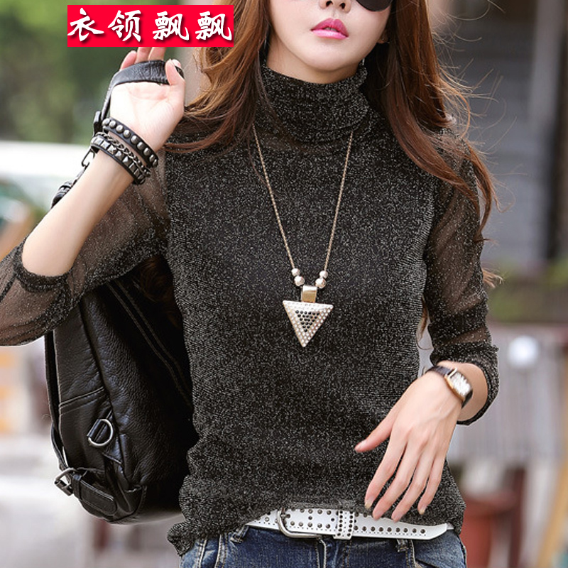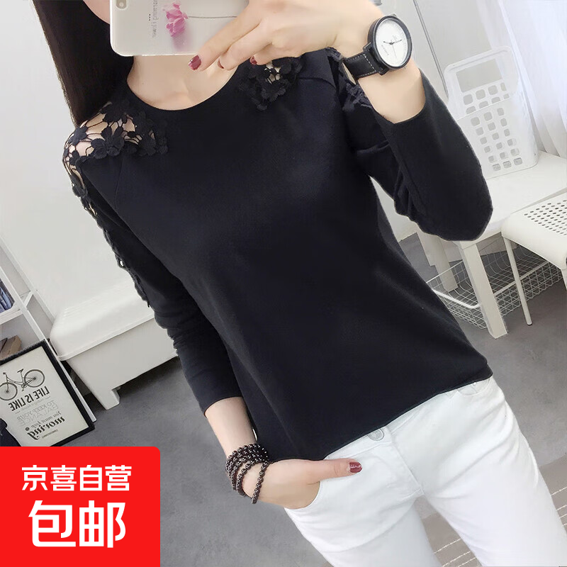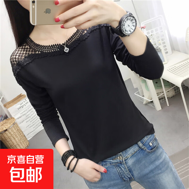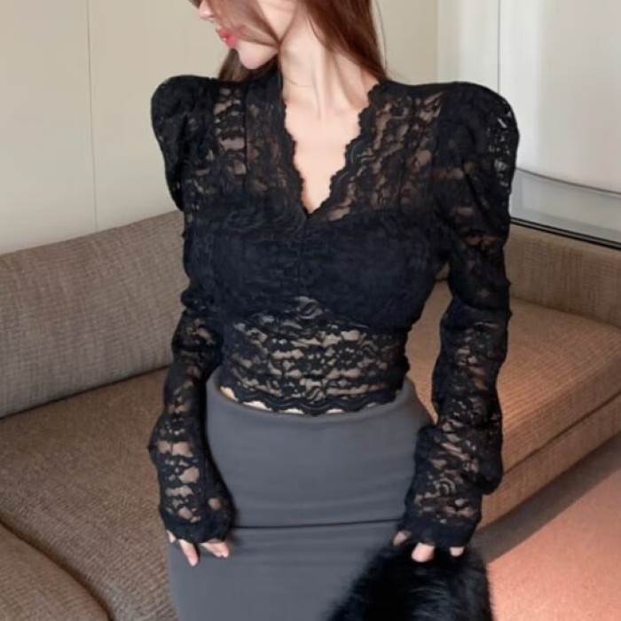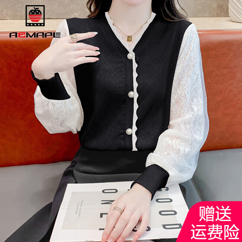 秋冬新款氣質(zhì)名媛v領(lǐng)黑色針織連衣裙長袖拼接蕾絲修身打底毛衣裙