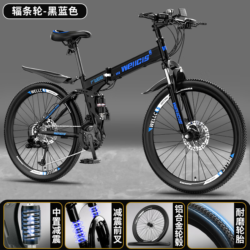 騎車去春游。永久折疊自行車成人男女山地車雙減震變速中學(xué)生頂配白黑色輻條輪24英寸