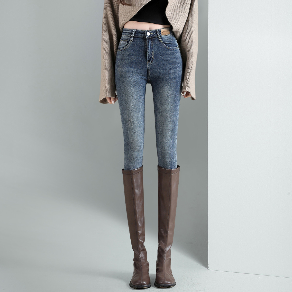 冬天就要穿這種微喇加絨牛仔褲復古藍顯瘦彈力褲