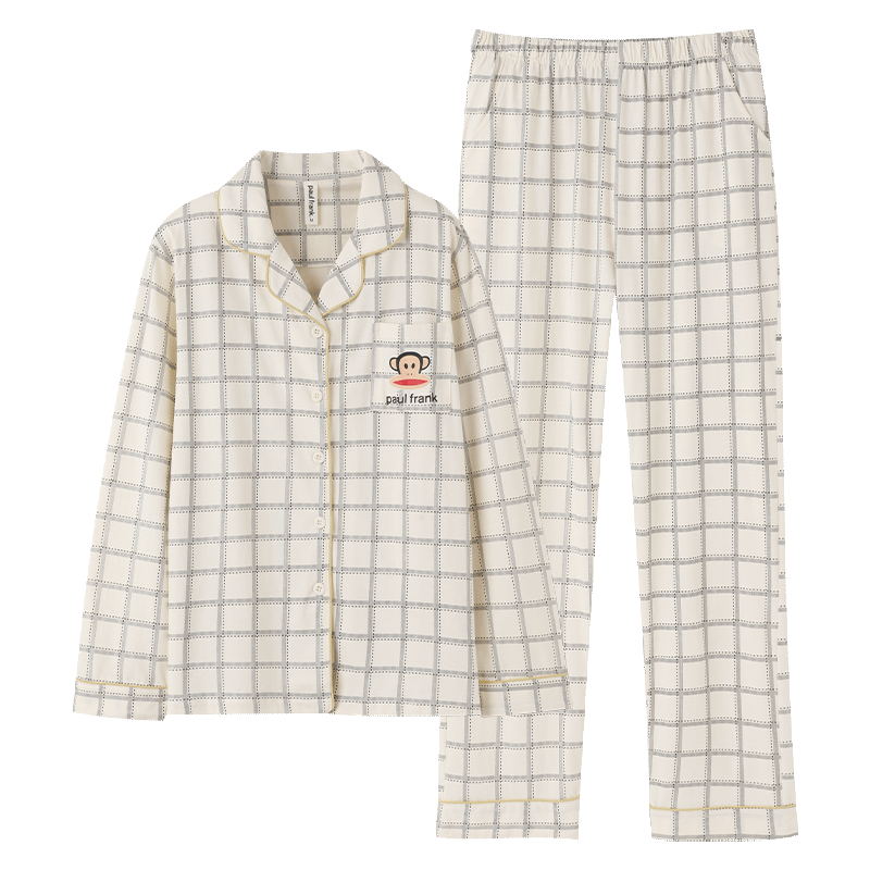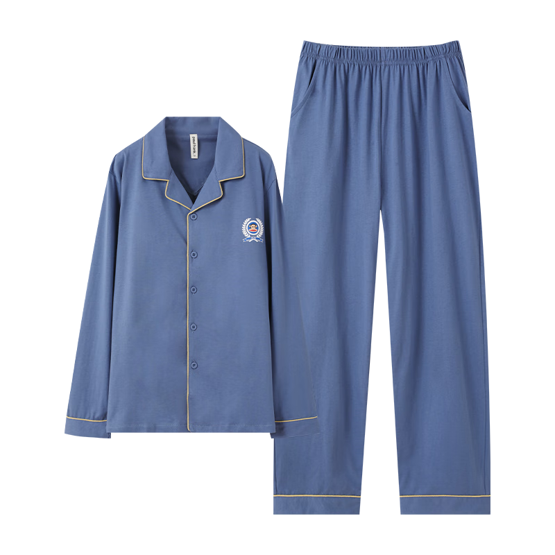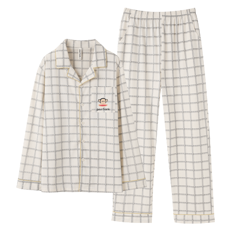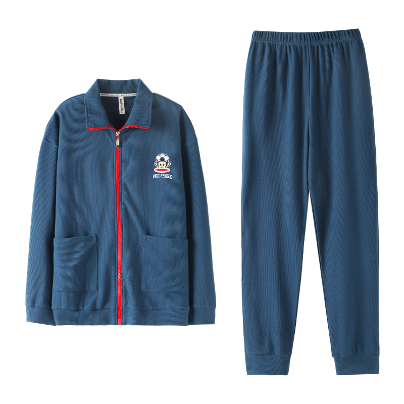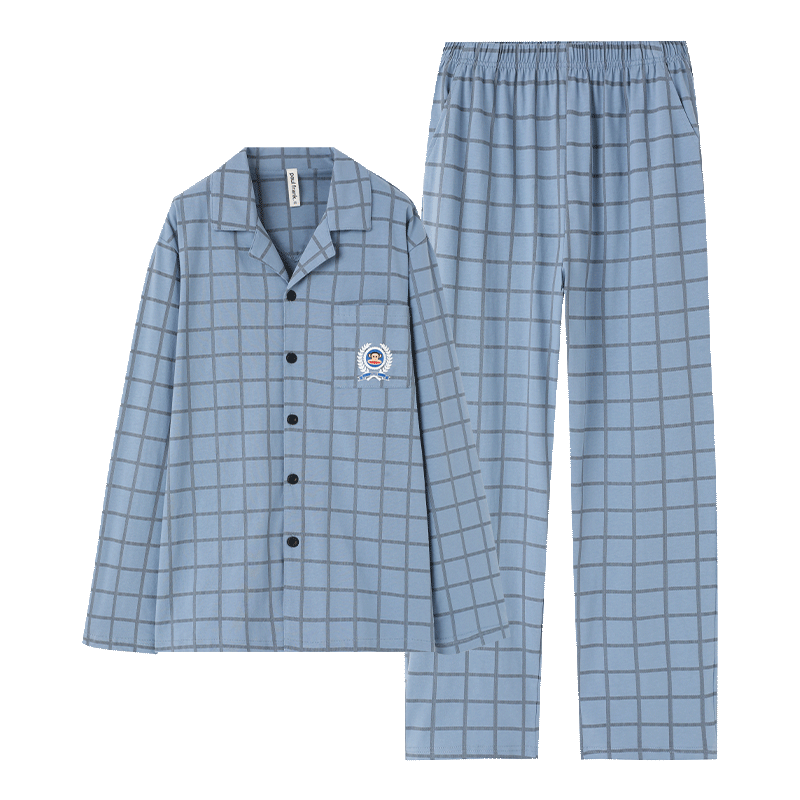 貓人男士睡衣男100%純棉灰色翻領(lǐng)開衫長袖睡衣男休閑可