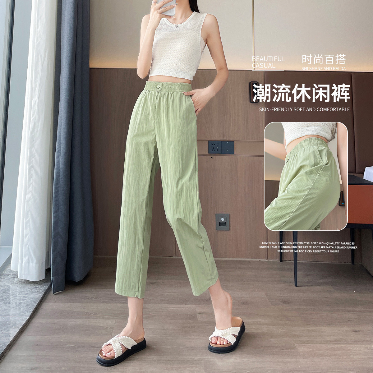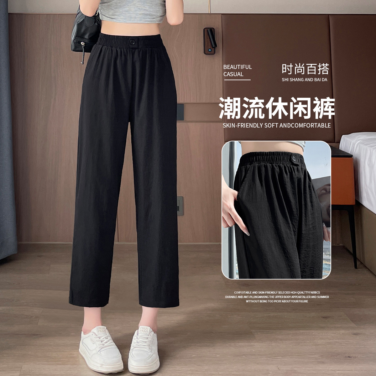 九分褲指褲子的長度按照人正常褲子長度的十分之九(9/10)長做出來的,或者褲子穿在身上之后的長度到腳踝位置的。九分褲是長褲的一種,但是它不同于普通長褲,差別是它的長度不超過腳踝。注:本名詞內(nèi)容引自百度百科