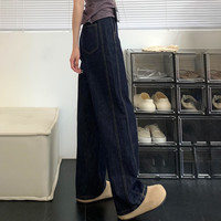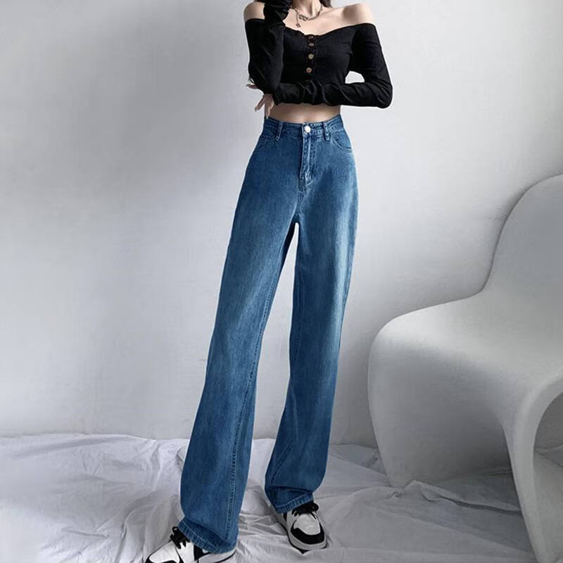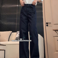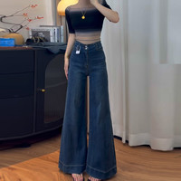 深藍(lán)色闊腿牛仔褲女2025夏季薄款高腰小個(gè)子顯高寬松拖地直筒褲子