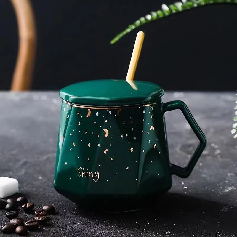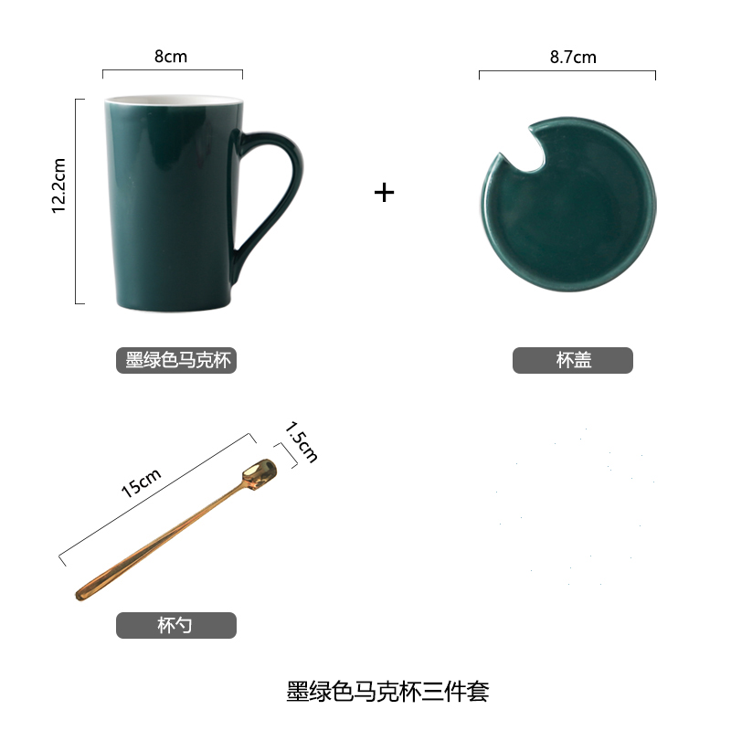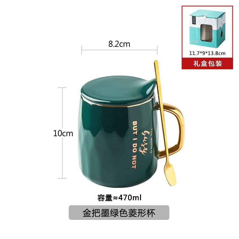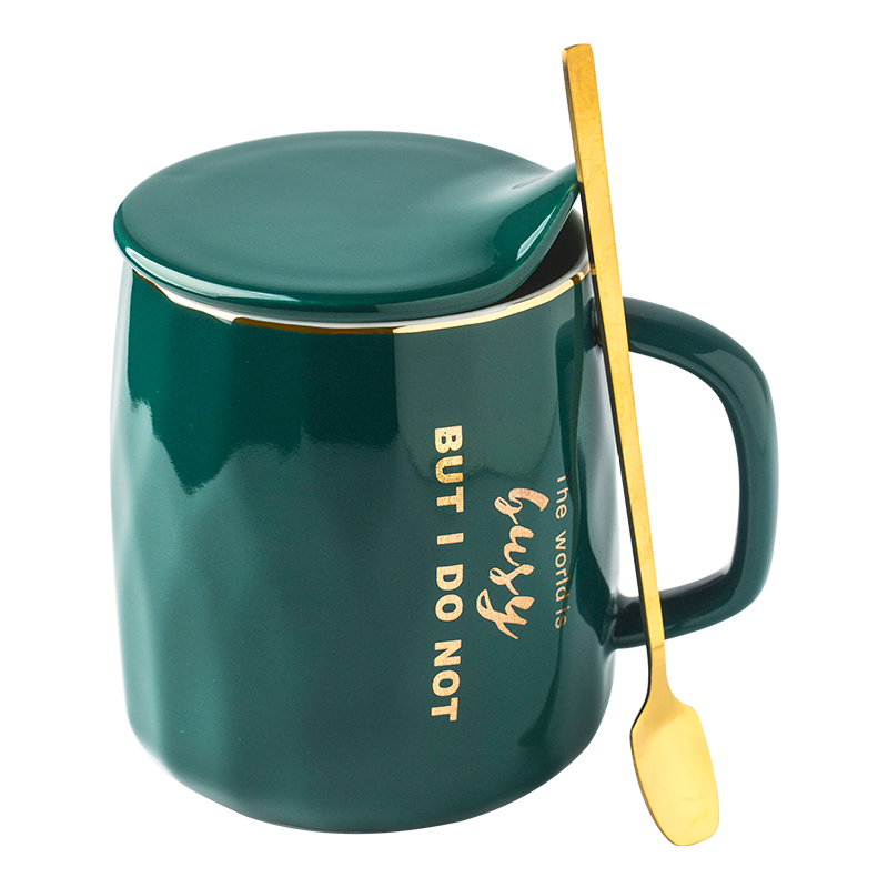 ?拜格(BAYCO)帶蓋馬克杯 陶瓷咖啡杯子喝水杯 帶勺子大容量牛奶杯 墨綠 BX6805沖沖沖沖呀值得信賴擁有