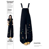 嵐燁春秋季網(wǎng)紅款洋氣減齡背帶褲女裝韓版寬松顯瘦垂感直筒牛仔長褲高腰闊腿連體褲子 黑色 M