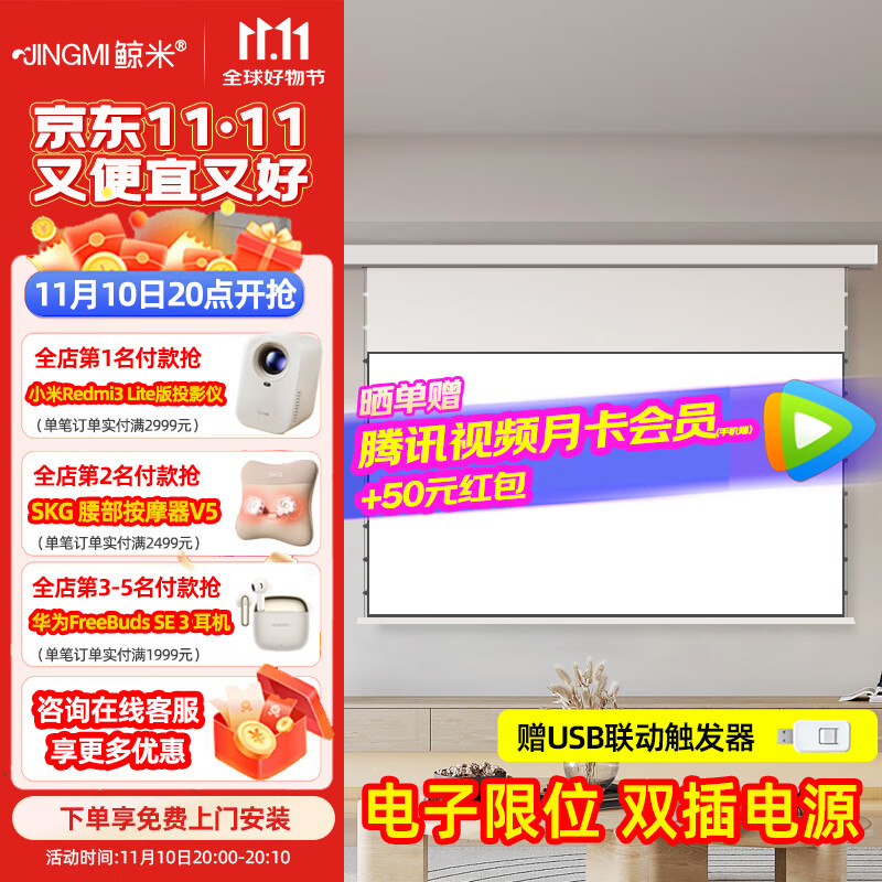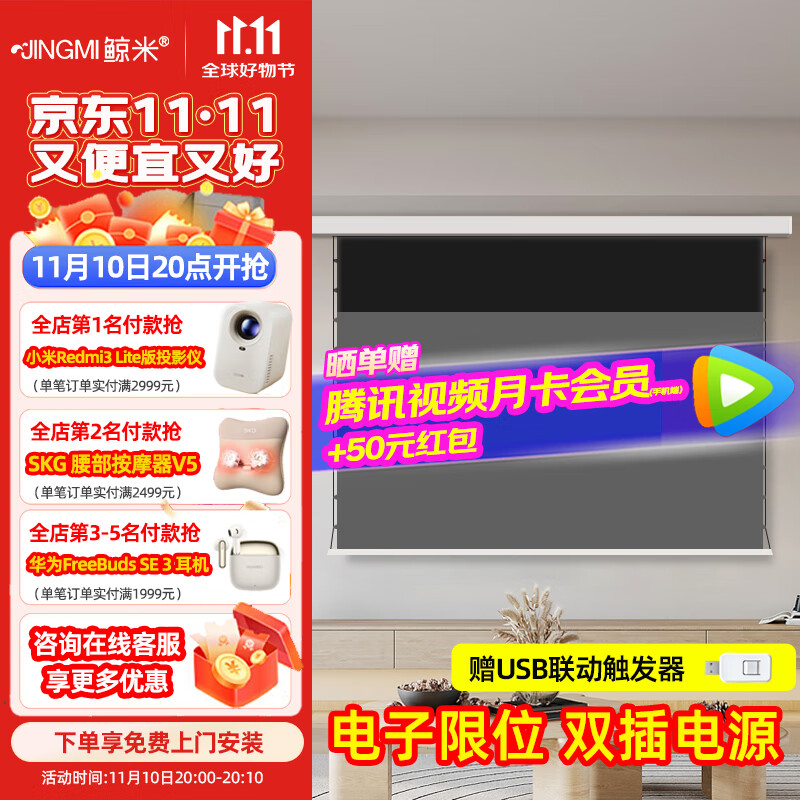 2199元鯨米(JINGMI)投影幕布電動拉線遙控自動升降高清8K家用投影配件光子幕布客廳臥室壁掛吊頂隱藏投影儀屏幕 【菲涅爾抗光FNS-暗藏黑邊丨吊裝正投-投影聯(lián)動】 100英寸16:9(送安裝)京東 2k