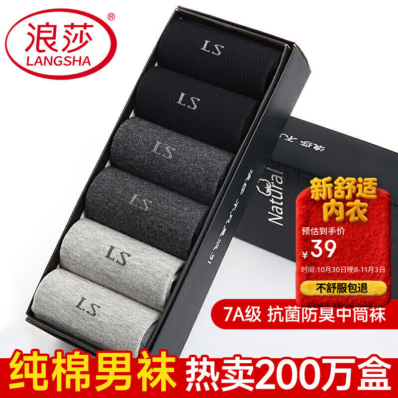 浪莎6雙襪子男純棉秋冬男襪舒適吸汗全棉男士運動短襪冬季休閑棉襪 黑色2深灰2淺灰2【100%棉】 適合38-46碼