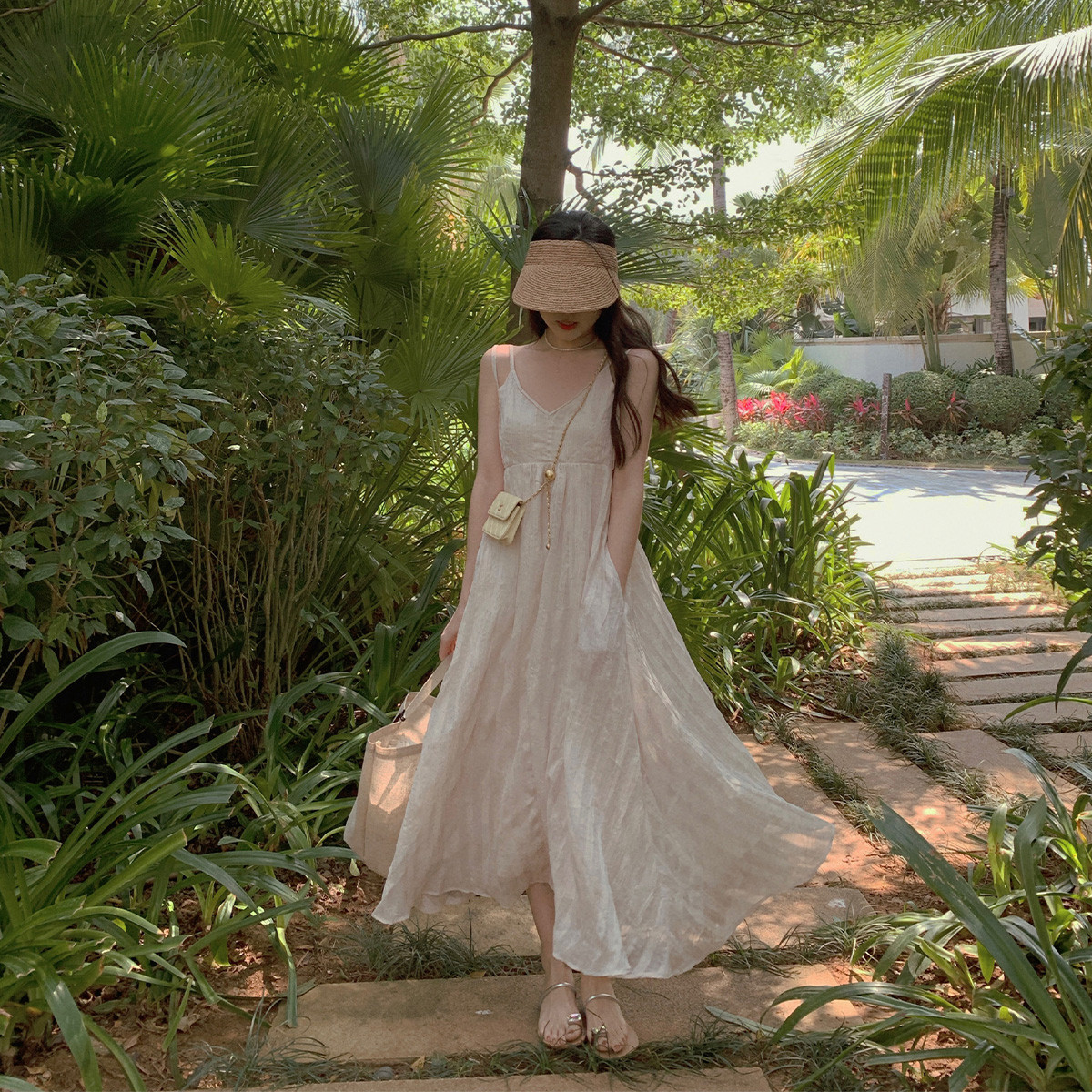 茶歇絕美掛脖吊帶連衣裙女夏季新款韓版度假風(fēng)寬松a字顯瘦長裙子茶歇絕美掛脖吊帶連衣裙女夏季新款韓版