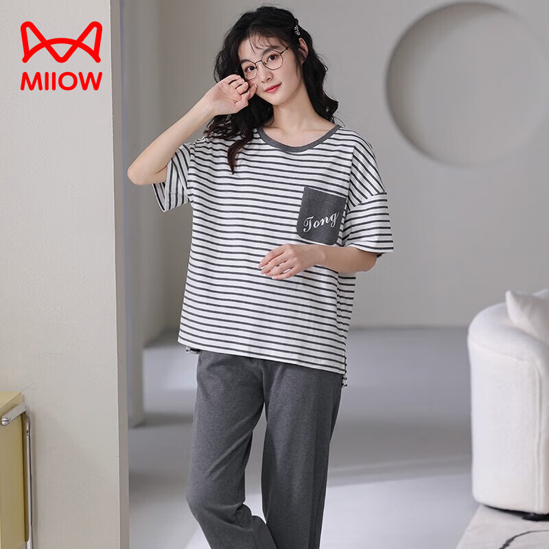 ?貓人睡衣女士長袖純棉套頭春秋款休閑寬松全棉家居服女兩件套裝 灰紫色6728 L【建議100-120斤】沖沖沖沖呀?貓