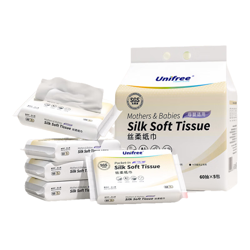 unifree抽紙3層60抽*5包面巾紙保濕紙嬰幼兒乳霜紙云柔紙巾