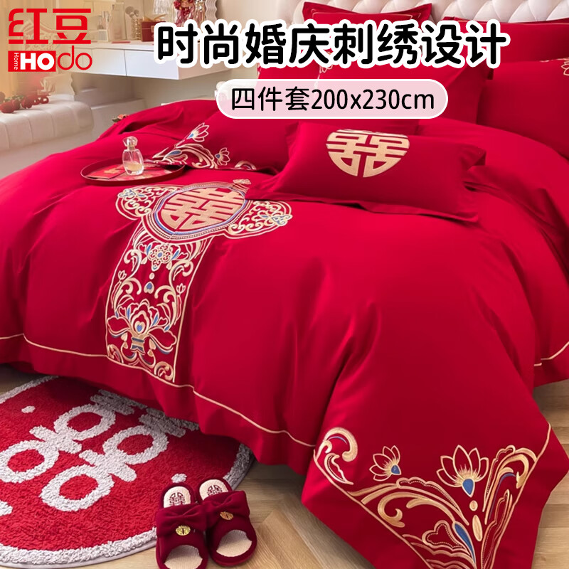 博洋家紡結(jié)婚四件套純棉紅色傳統(tǒng)刺繡婚慶套件龍騰鳳躍