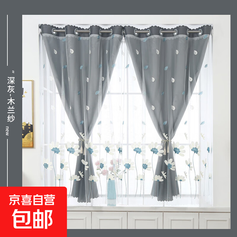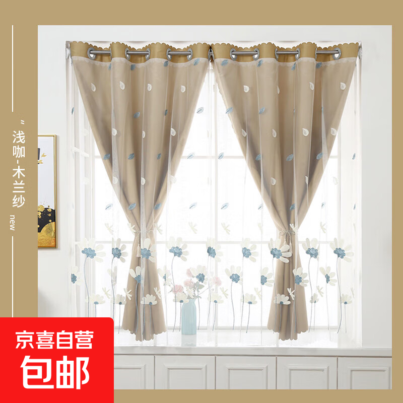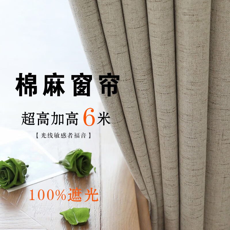 水星家紡窗簾遮光臥室全遮光布遮陽隔音飄窗奶油風掛鉤式2片米色