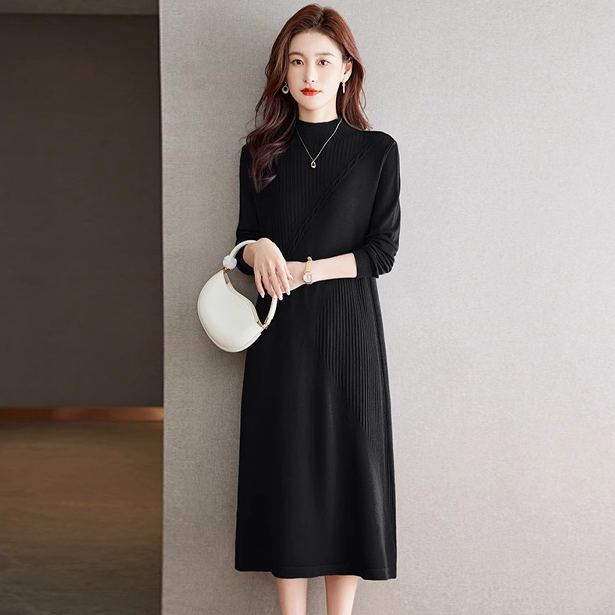 法式配大衣裙子中長(zhǎng)款毛衣裙過膝氣質(zhì)針織內(nèi)搭打底連衣裙女秋冬季