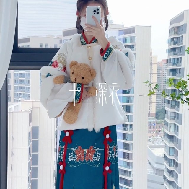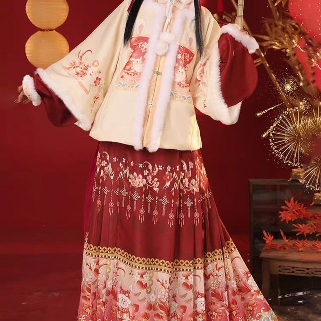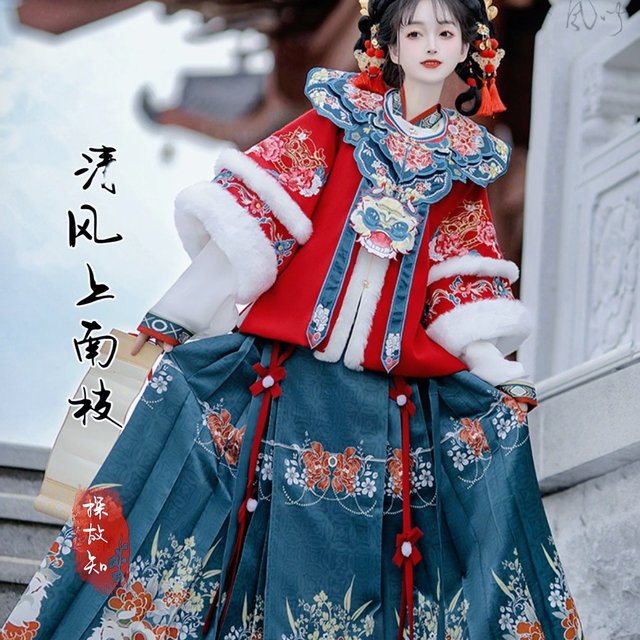 原創(chuàng)秋冬漢服女中國(guó)風(fēng)改良古裝加絨明制馬面裙齊腰襦裙紅色拜年服