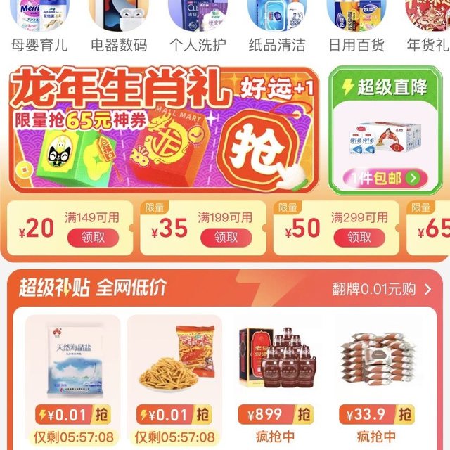 可領(lǐng)取6個(gè)門檻共12張紅包!天貓超市 0