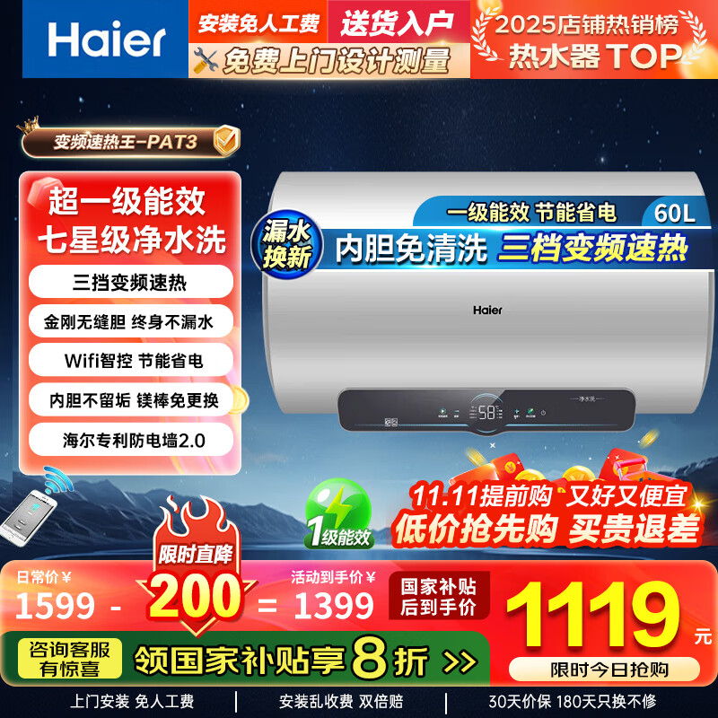 1499元海爾(Haier)熱水器電熱水器家用60升80升變頻速熱儲(chǔ)水式一級(jí)能效洗澡節(jié)能省電內(nèi)膽免清洗防電墻海爾智家出品 80L 3300W 三檔變頻/鋯金阻垢科技/PH5京東 5k