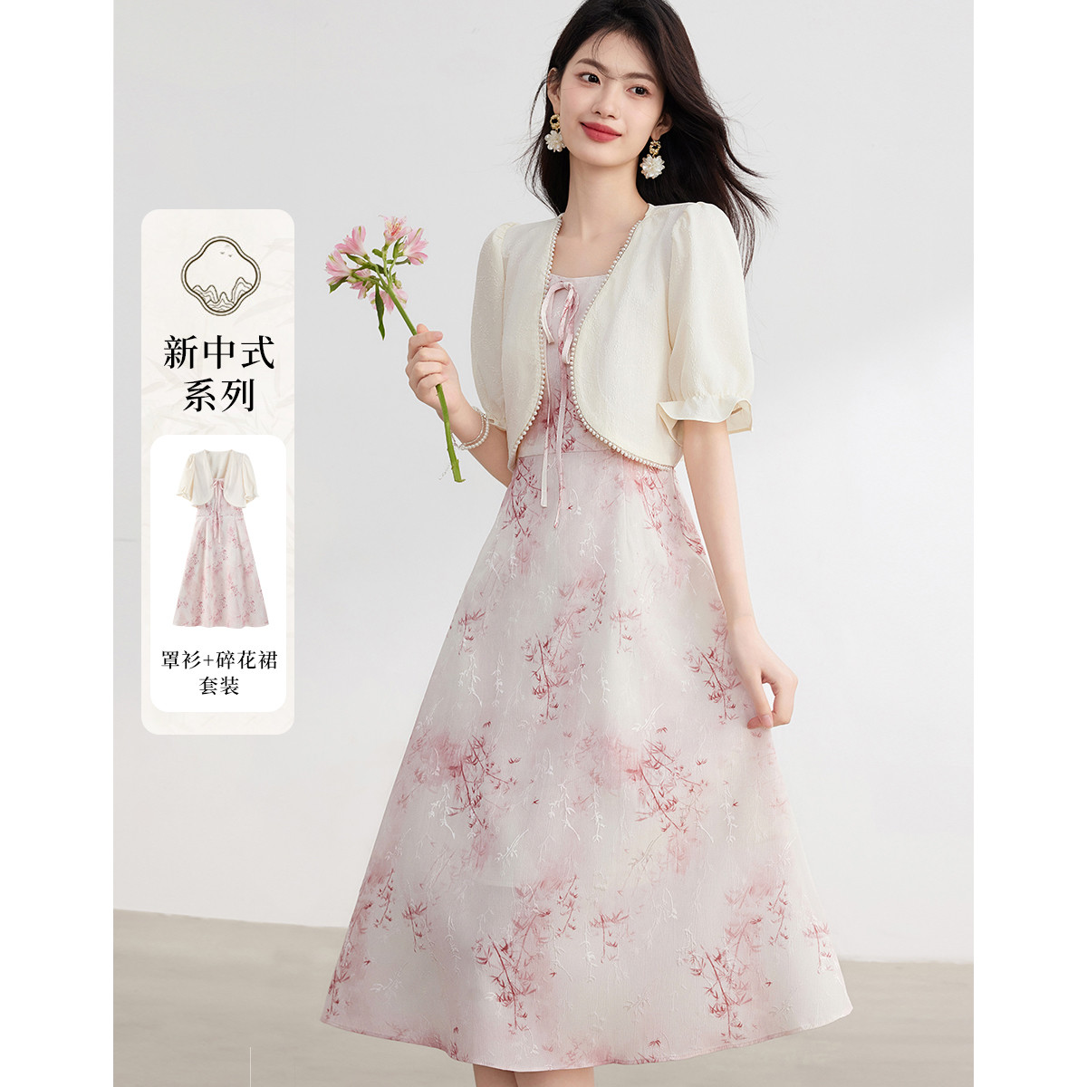 醋酸緞面吊帶連衣裙女春夏小個子高端雪紡休閑西裝裙兩件套裝夏款