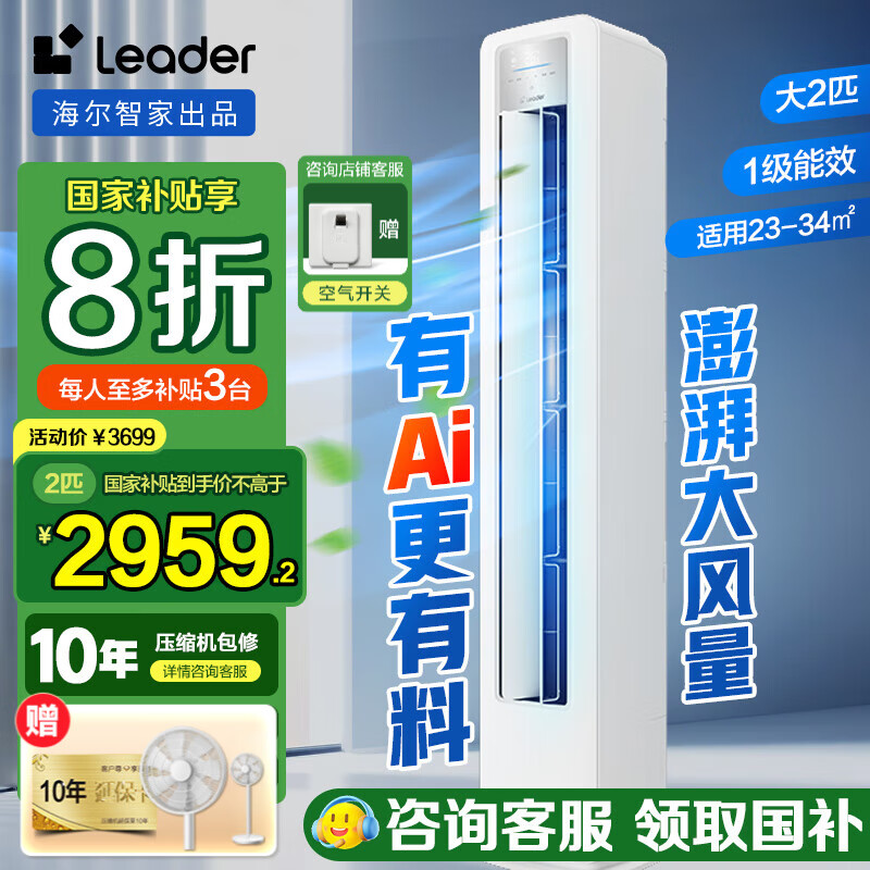 海爾智家 Leader空調(diào)柜機(jī) 2匹 50WDB81 - 新一級能效急速制熱直流變頻冷暖家用客廳空調(diào)立式省電