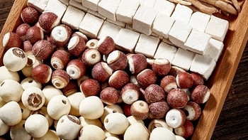 略呈橢圓形或類球形,長1.2~1.8cm,直徑0.8~1.4cm。表面淺黃棕色至紅棕色,有細縱紋和較寬的脈紋。一端中心突起,深棕色,多有裂口,其周邊略下陷。質硬,種皮薄,不易剝離。子葉2,黃白色,肥厚,中有空隙,具綠色蓮子心。氣微,味甘、微澀;蓮子心味苦。注:本名詞內(nèi)容引自百度百科。