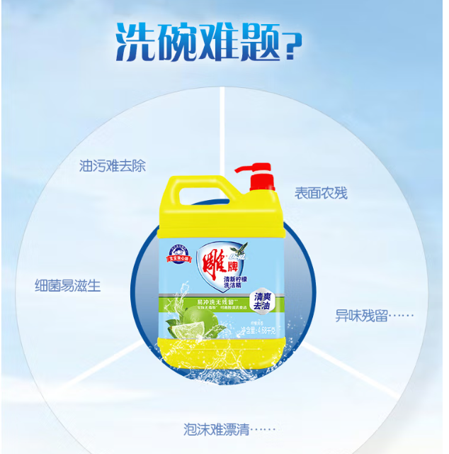 洗潔精,日常生活清潔用品。潔凈溫和、泡沫柔細(xì)、快速去污、除菌,有效徹底清潔、不殘留,散發(fā)淡雅果香味,洗后潔白光亮如新。時常使用以確保居家衛(wèi)生,避免病菌傳染。注:本名詞內(nèi)容引自百度百科