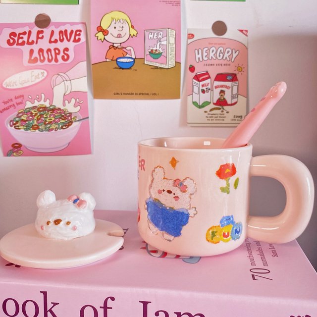 馬克杯帶蓋帶勺子杯子陶瓷女學(xué)生韓版可愛(ài)水杯家用早餐咖啡喝水杯