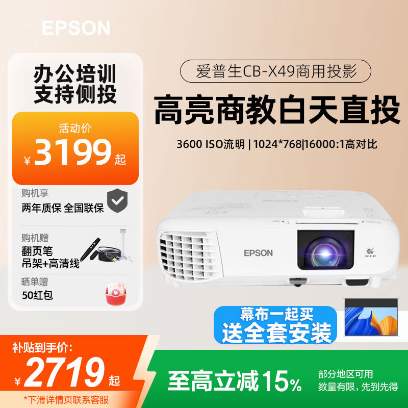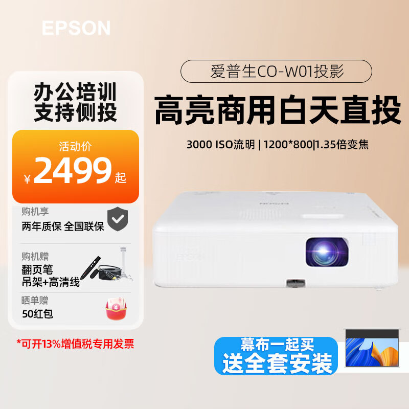 4192元愛普生(EPSON)投影儀辦公 家用高清會議培訓(xùn)商務(wù)投影機教學(xué)便攜投影儀 CB-E10 【下單即發(fā)升級款】 標(biāo)配 150英寸電動幕布 吊架 高清線 安裝京東 500